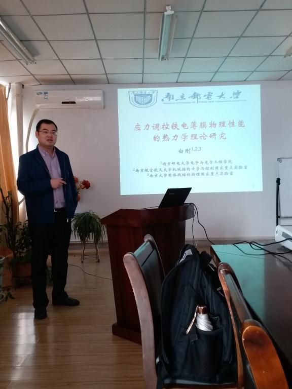 应中心邀请,南京邮电大学白刚副教授于10月2日来访并作题为“应力调控铁电薄膜物理性能的热力学理论研究”的学术报告。报告会上,白老师首先讲述了铁电薄膜的起源、发展、应用及其物理性能的热力学理论推导;接着白老师从朗道-金兹堡-德文希尔非线性唯象热力学理论出发,讲述了应力对PbTiO3厚膜和SrTiO3/Si异质结的物理性能的影响规律及应力梯度在中心对称介电体材料中诱发的多卡效应,展示了理论计算研究对微纳米尺度的压电/铁电等智能材料的实验和理论研究的重要指导意义。