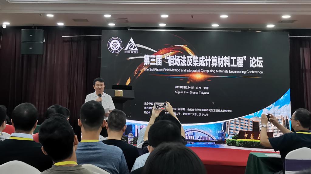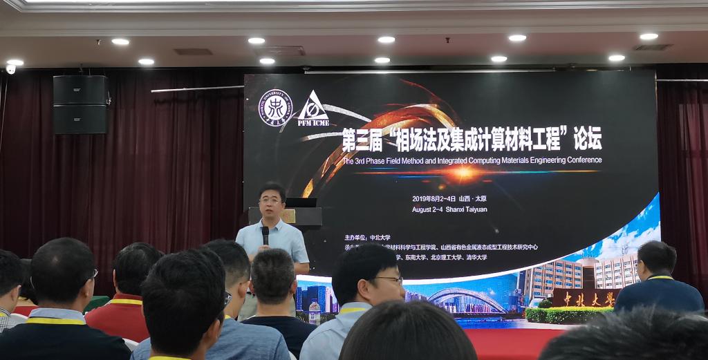 由中北大学主办,中北大学材料科学与工程学院以及中心承办的第三届“相场法及集成计算材料工程(PFM-ICME2019)”论坛于2019年8月2日至2019年8月4日在山西省太原市黄河京都大酒店成功召开。论坛由沈兴全校长、李魁武院士、王一德院士、谢建新院士等担任顾问,中心主任赵宇宏教授担任主席。论坛得到了西北工业大学、东南大学、北京理工大学、清华大学等单位的支持。
