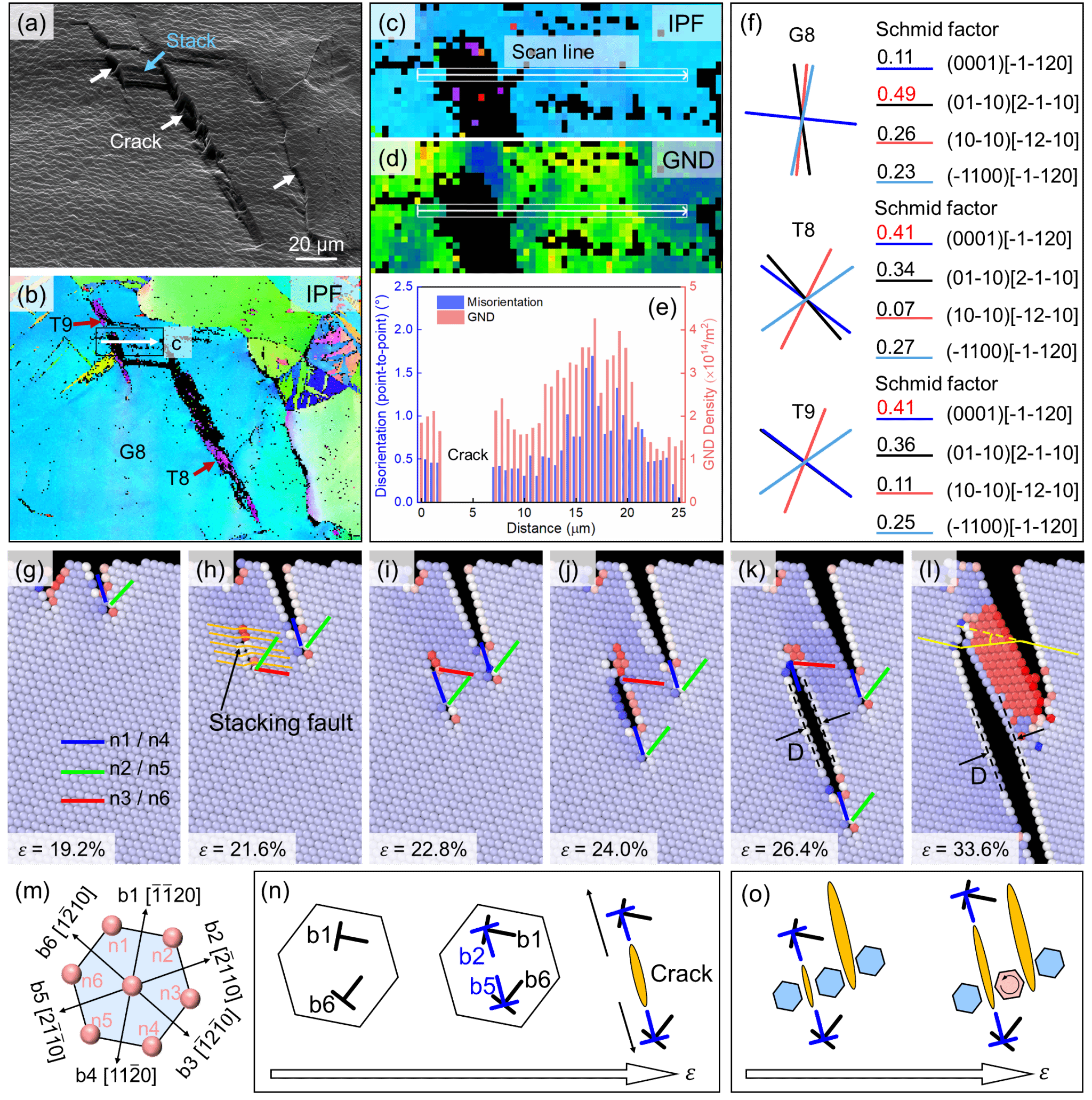 图 (a) 扫描电镜下的裂纹;(b, c) 晶界取向分布;(d) 1/2<11-20>几何必要位错分布;(e) 取向与位错的线扫;(f)滑移轨迹和Schmidt因子计算;(g-l) 裂纹形核与扩展过程的晶体相场模拟;(m) {000}上的位错与Burgers矢量关系示意图;(n) 位错增殖与传播路径示意图;(o) 裂纹扩展引起晶粒旋转示意图