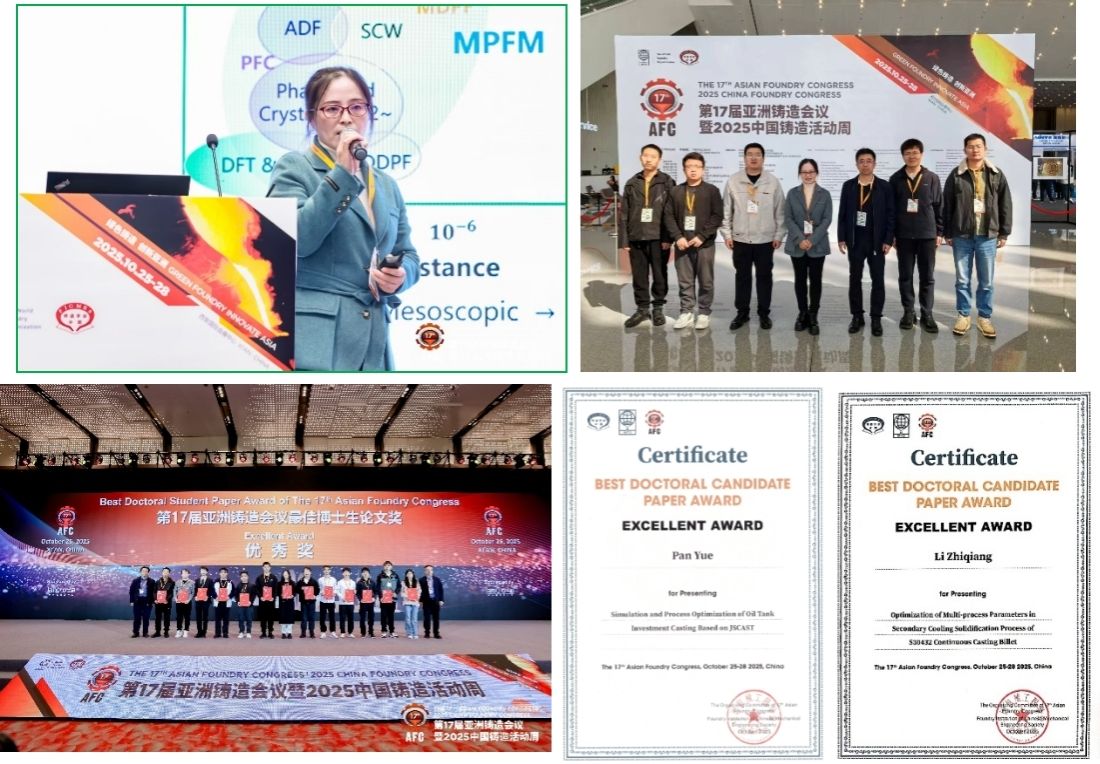 我校材料学院教育部铝镁协同创新中心团队7名师生应邀参会。赵宇宏教授做了题为“相场与铸造软件自主研发与应用”的邀请报告,博士生李志强“S30432 连铸方坯二冷凝固过程多工艺参数优化”、潘玥“铝合金油箱熔模铸造充型过程数值模拟”在亚洲科技青年论坛中荣获最佳博士生论文优秀奖,相关成果引发与会专家广泛关注与高度评价,彰显了团队在铸造领域学术实力与创新水平。