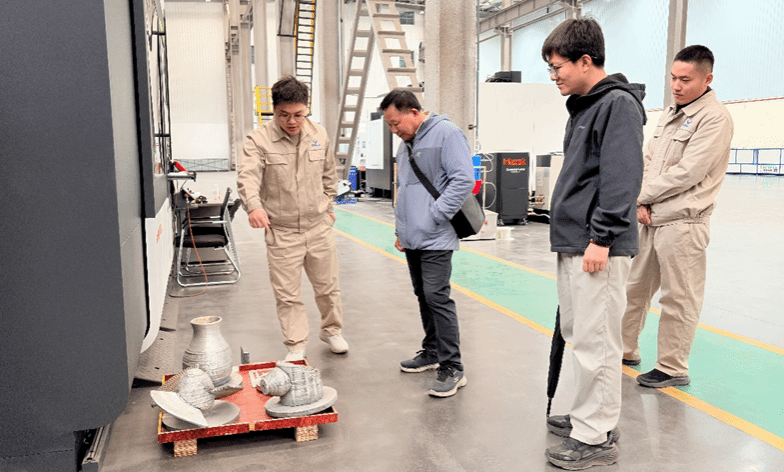 庄林忠教授详细考察了该公司铝、镁等轻金属专用丝材制备、3D打印工艺及后处理的生产过程,与企业人员探讨了金属丝材制备质量稳定性与打印工艺参数优化这两个关键环节。他结合国际前沿技术动态与工业生产的实际需求,就铝、镁合金丝材的纯净度控制、直径均匀性提升等核心工艺问题提出了中肯建议。同时,针对企业在面向复杂构件打印时遇到的工艺难题,庄教授现场分享了关于打印路径规划、热输入控制及缺陷抑制等方面的优化思路,为企业进一步提升产品性能与成品率提供了直接的技术支持。